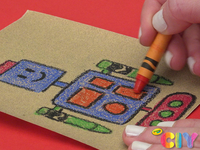 Ask an adult to trim crayons with craft knife to fit in outline. Glue to cardstock.