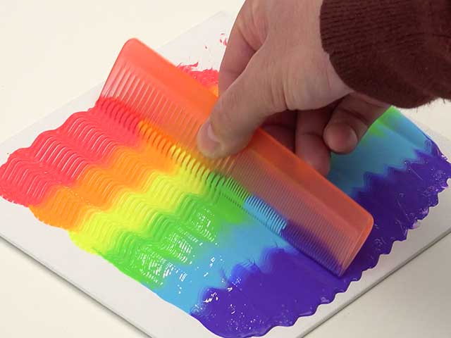 To create Rainbow Comb Painting: Pour small amount of each paint color onto canvas, overlapping slightly.