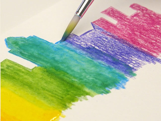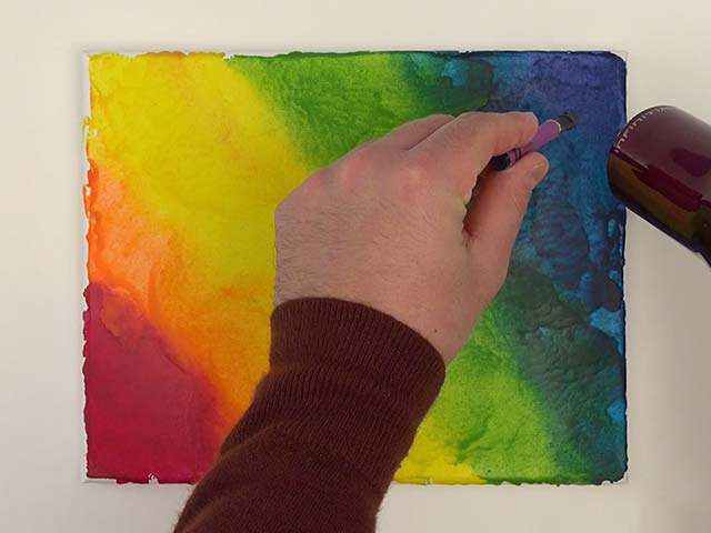 Paint over crayon with watercolors to reveal the resist. Dry 1–2 hours.