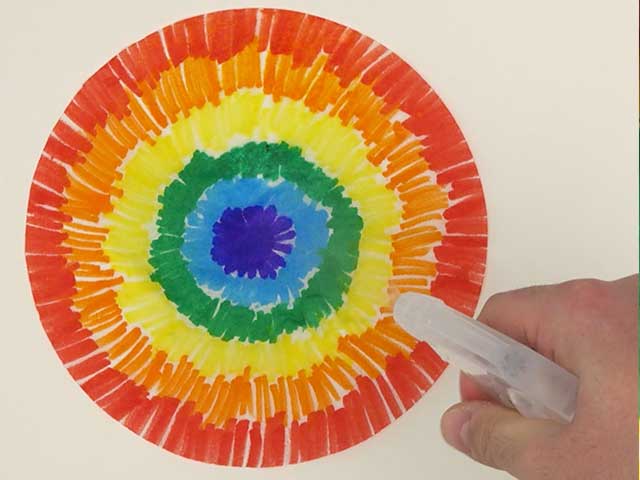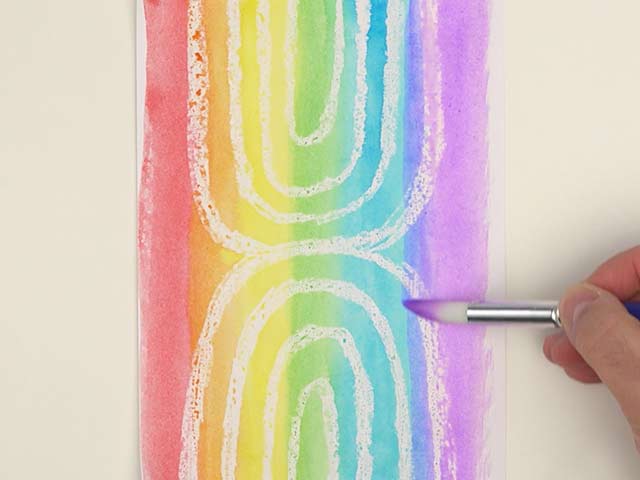 To create Rainbow Watercolor Resist Art: Draw design with white crayon on white cardstock.