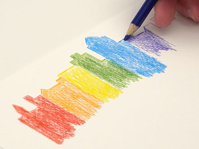 To create Rainbow Watercolor Drip: Sketch and color cityscape with watercolor pencils on cardstock.