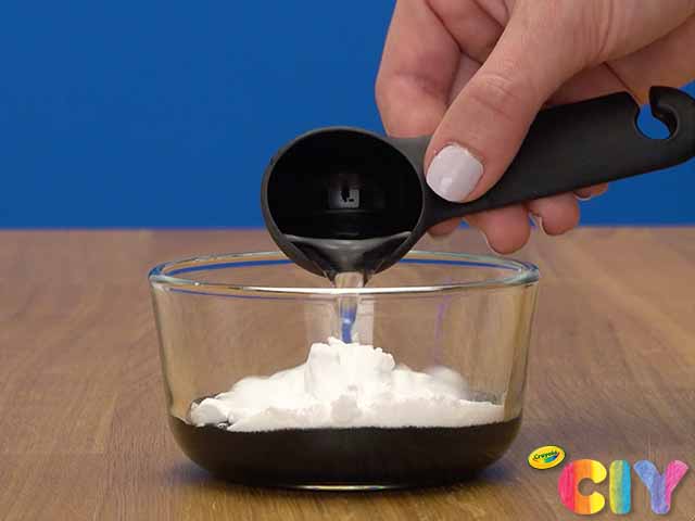 Add 2 Tbsp baking soda and 1 Tbsp water to mixing bowl. Combine mixture with craft stick.