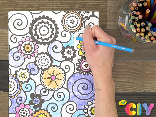 Choose your favorite coloring page and fill in line art with colored pencils. Set aside.