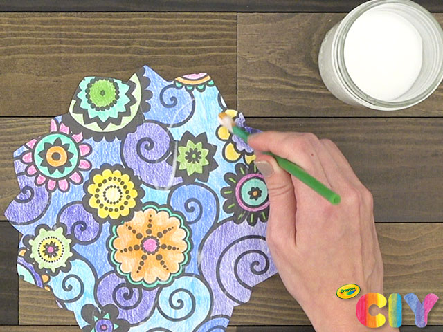 Using a paint brush, add layer of glue mixture onto the colored-in side of the coloring page.
