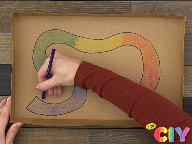 On bottom of upcycled shirt box, draw outline of curvy track with markers.