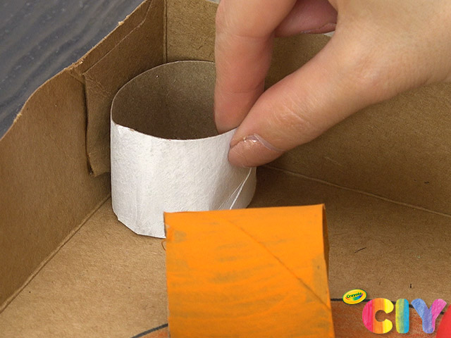 Glue final paper towel roll section to corner of box. Dry 1–2 hours.