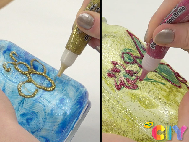 Outline bugs or fairies—plus add any embellishments—with glitter glue. Dry 3–4 hours.
