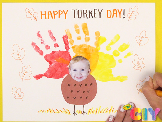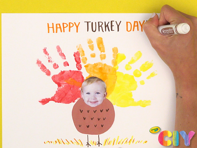 Cut out photo of child’s face. Glue to top of turkey body. Let all glue steps dry 15 minutes.