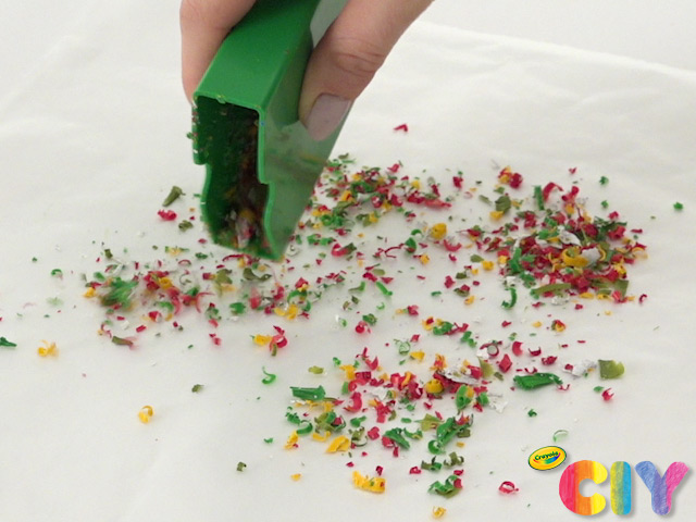 Unwrap 2–6 crayons, then use crayon sharpener to create shavings.
