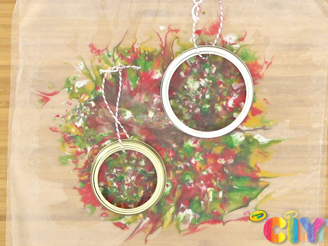 Create melted crayon art in the form of DIY ornaments. Melted crayon shavings and a few other supplies turn mason jar lids into homemade holiday decorations!