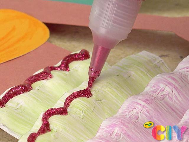 Add sparkly details to tail with glitter glue. Let all glue steps dry 3–4 hours.