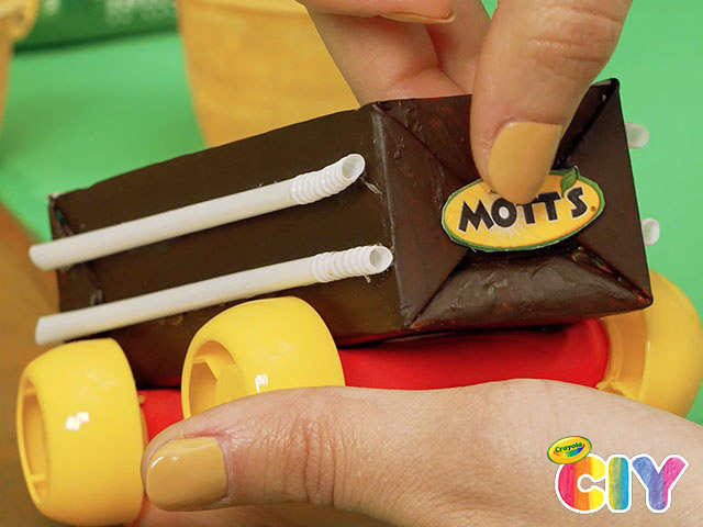 Cut out a section from Mott’s applesauce cups (with the Mott’s logo), then glue it to the hood of the truck.