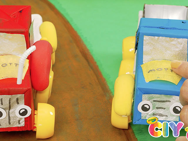 Cut out eyes from Mott’s apple juice boxes and glue to the front of the truck as headlights.