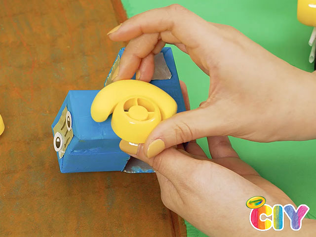 Cut 4 Mott’s apple juice straws and glue 2 pieces to each side of the brown box.