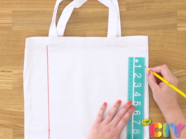 Using a pencil and ruler, make a tick mark at the top and bottom of the bag, both at an equal distance from the left edge.
