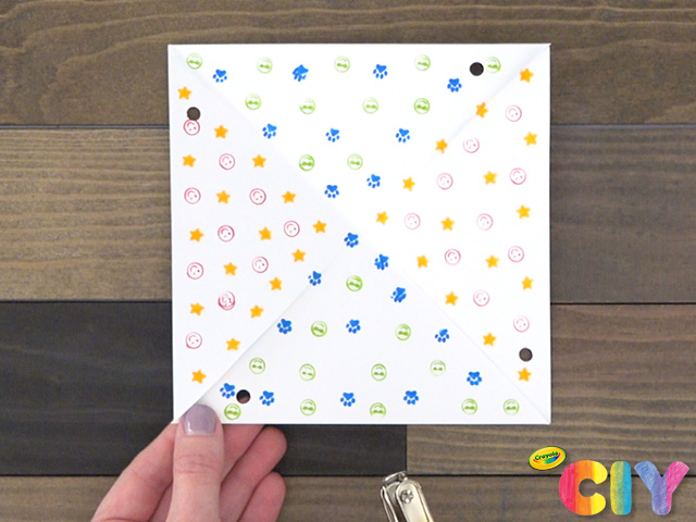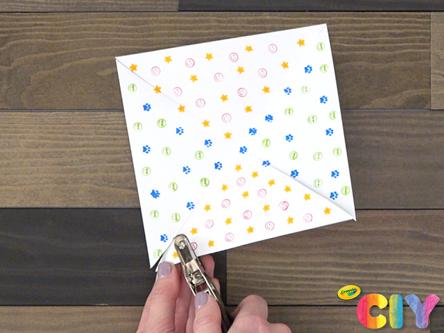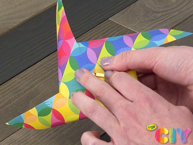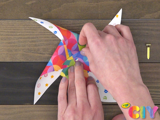 Hold in place and insert brass fastener, flattening legs to hold pinwheel in place.