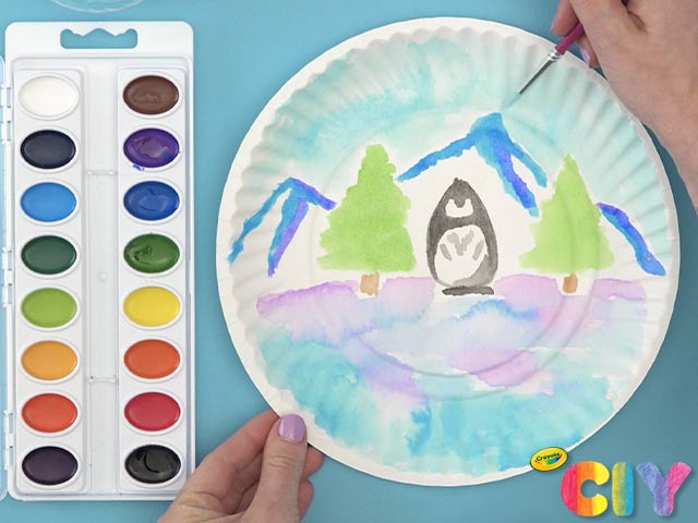 Paint wintry scene on a paper plate with watercolors. Dry 1–2 hours.
