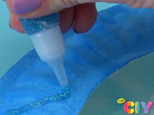 Add sparkly accents to paper plate and snow globe base with glitter glue. Dry 3–4 hours.