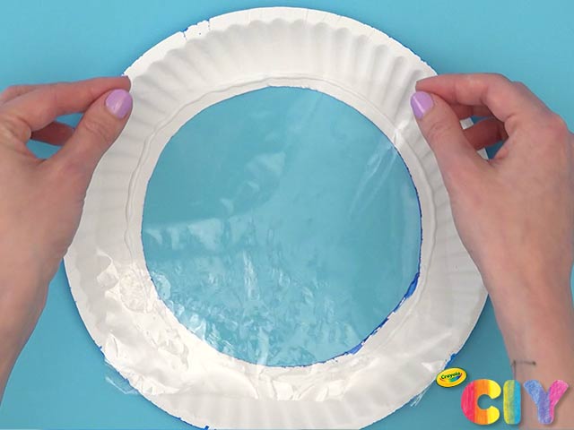 Flip plate right-side up and glue plastic wrap to edge of plate, covering the opening. Set aside and dry 1–2 hours.