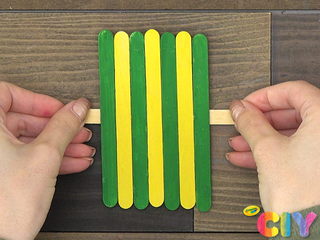 Line up painted popsicle sticks side by side. Glue unpainted popsicle stick across the middle to hold sticks together and create base for monster arms.