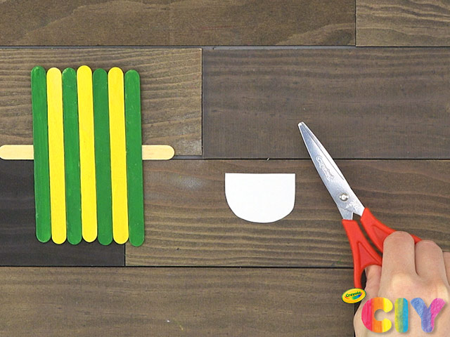 Draw teeth in mouth with markers. Glue to popsicle sticks.