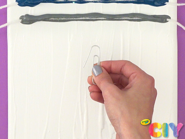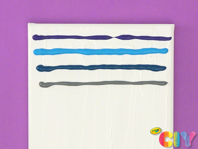 While white paint is wet, add horizontal lines of other paint colors across canvas.