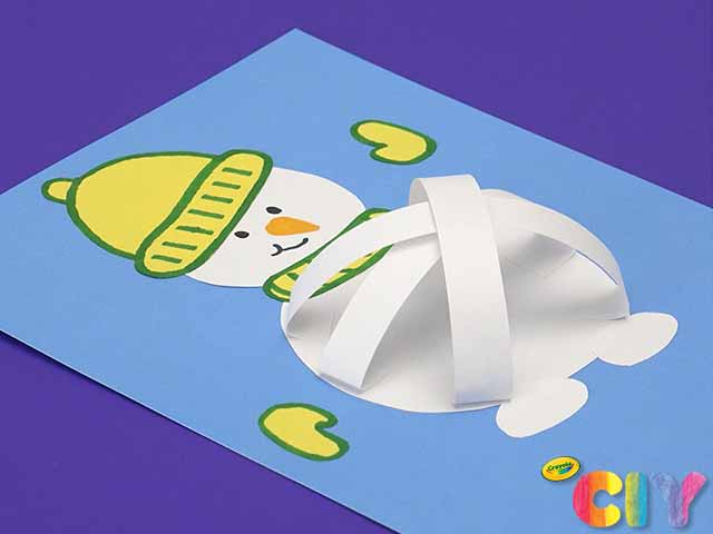 Lightly fold ends of blank paper strips. Glue to snowman belly horizontally and diagonally for 3D effect.