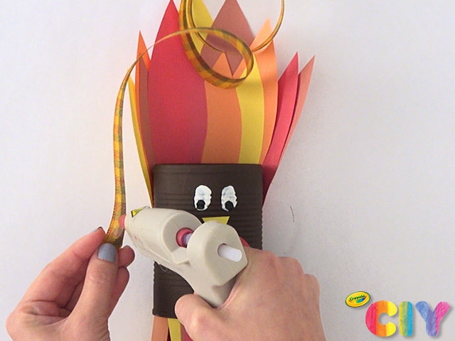 To create hanger, cut a piece of ribbon and hot glue ends on 2 sides of can. Let cool.