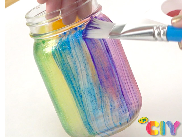 To make the sparkly pencil holder, paint a mason jar in a rainbow pattern. Let dry 1–2 hours.