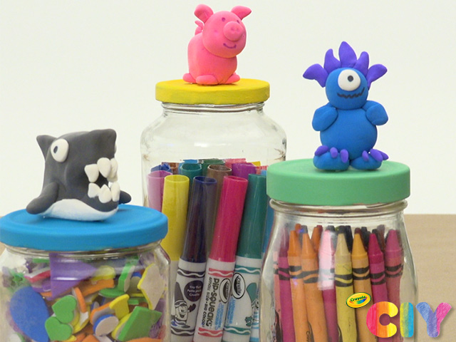 Organize craft supplies inside a DIY glass storage jar, a cool upcycled craft idea. The Model Magic topper on the lid makes this kids’ craft fun to make and display!