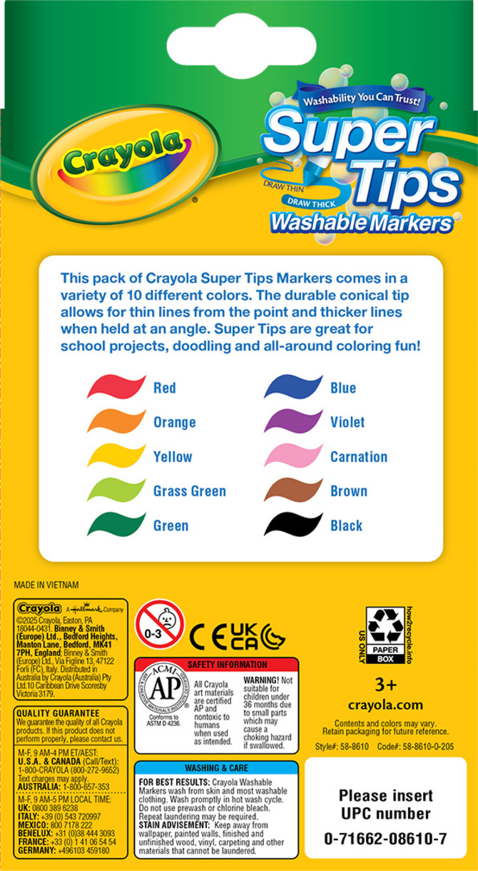 SCHOOL: Crayola's non-toxic and washable formula is perfect for the home, the school classroom and art classes. Super Tips Markers are the ideal marker choice for school booklists. A great addition to any pencil case!