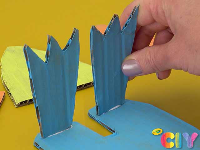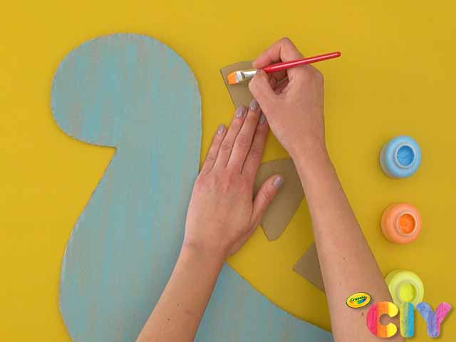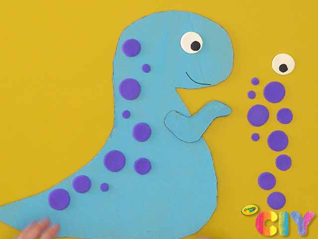 Sketch and cut out cardboard dinosaur body, scales, arms, legs, and feet.
