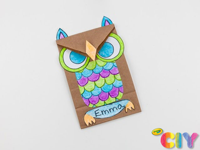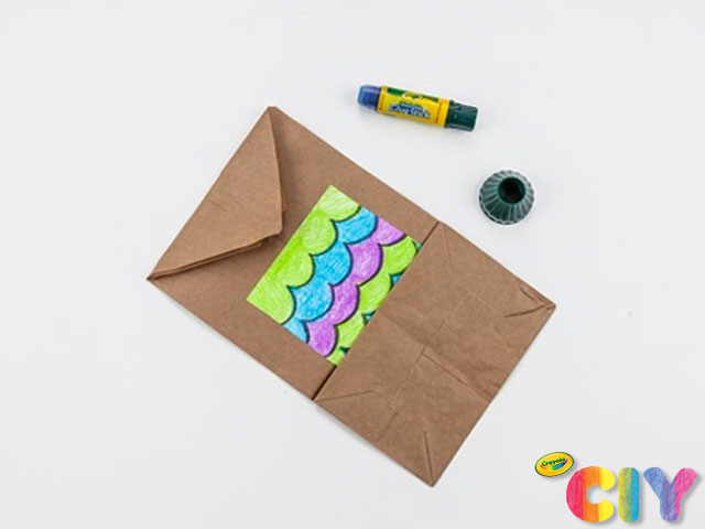 Pega los ojos, el cuerpo, los pies, las orejas y el pico en la bolsa con una barra de pegamento Crayola.