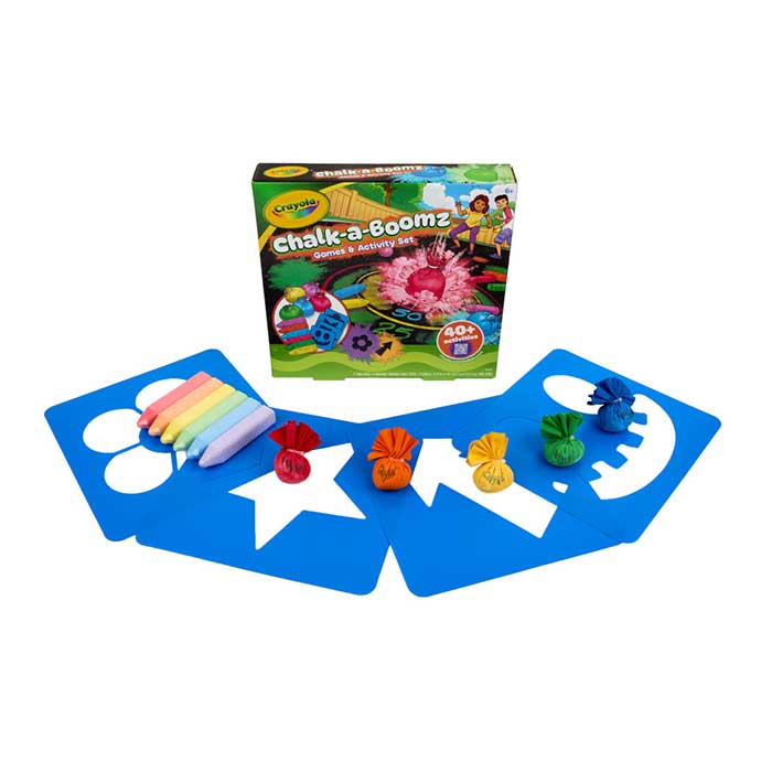 • The Crayola Chalk‑A‑Boomz Outdoor Activity Kit delivers instant color‑filled fun with everything kids need for energetic, creative play. Toss the washable chalk balls to watch bright splashes appear on sidewalks, then use the included stencils and sidewalk chalk sticks to design custom games and vibrant outdoor art. Perfect for families, parties, and neighborhood playdates, Chalk‑A‑Boomz brings kids together through teamwork, laughter, and bold bursts of color. This all‑in‑one outdoor kit keeps children active while sparking imaginative play—and cleanup is effortless. When the fun wraps up, simply wash the chalk away and get ready for the next round of colorful action.