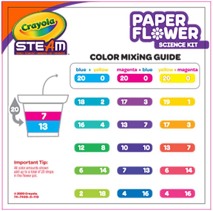 • Colors bloom before your very eyes with the Crayola STEAM: Paper Flower Science Kit. This hands-on educational toy lets kids learn about the science of water "wicking" as they create colorful paper flowers. This magical craft kit makes a great gift for girls and boys for birthdays, holidays or any occasion. The kit features everything needed to make 12 Wicking Paper Flowers, as well as a guide with step-by-step instructions. Ideal for kids, ages 7 and up! Looking for refills? Once your petal sheets are all used, we recommend white coffee filters to keep the fun going! For more tips, see our Paper Flowers FAQ.